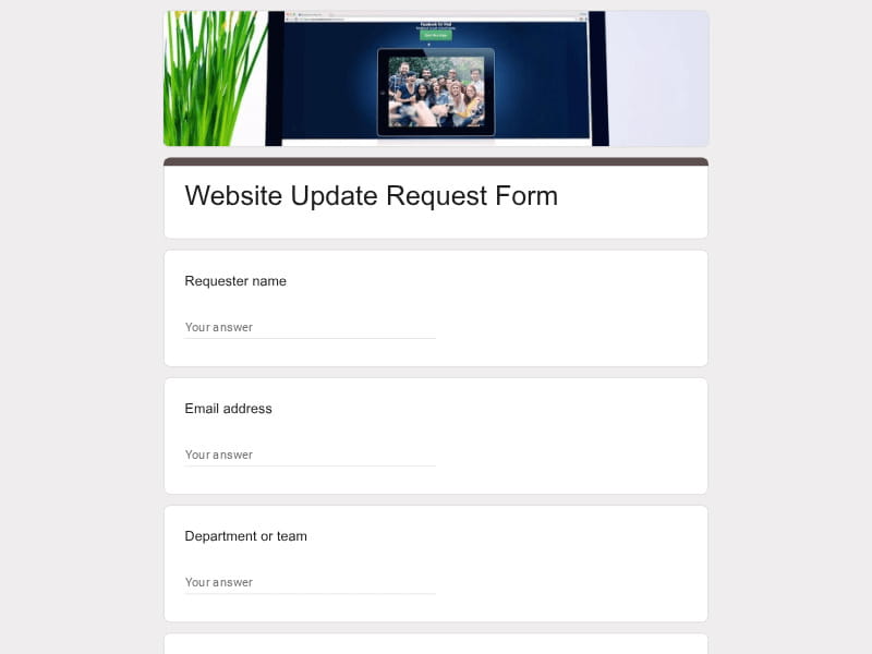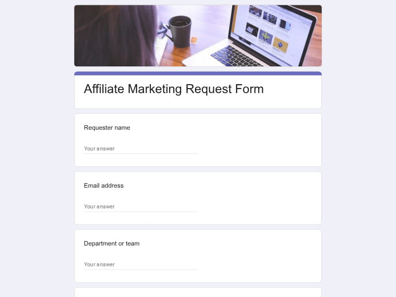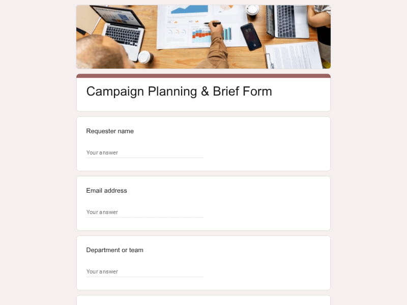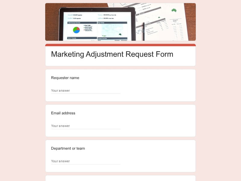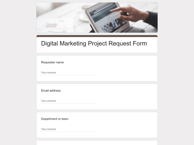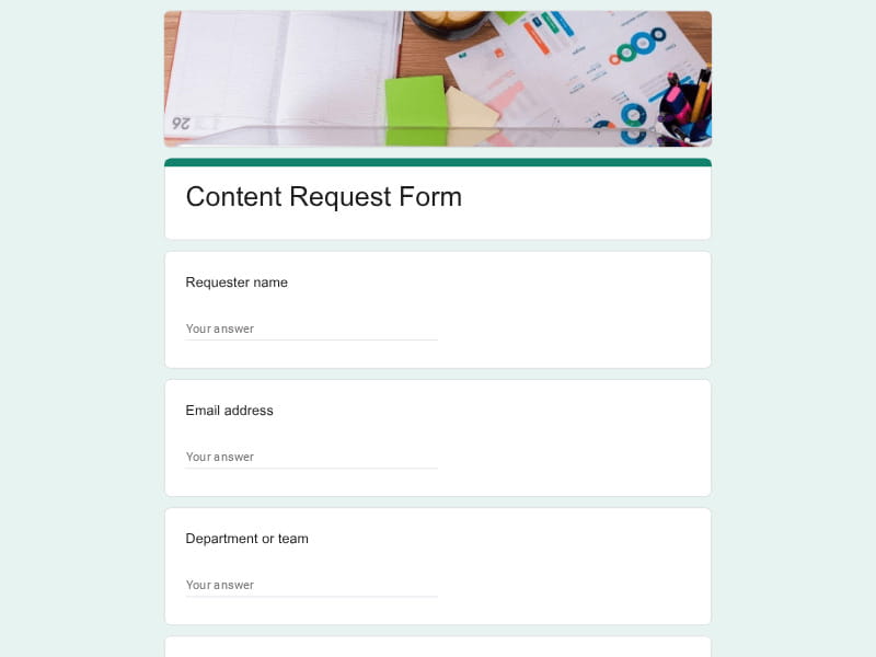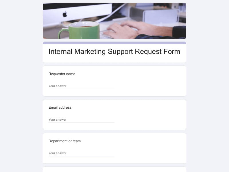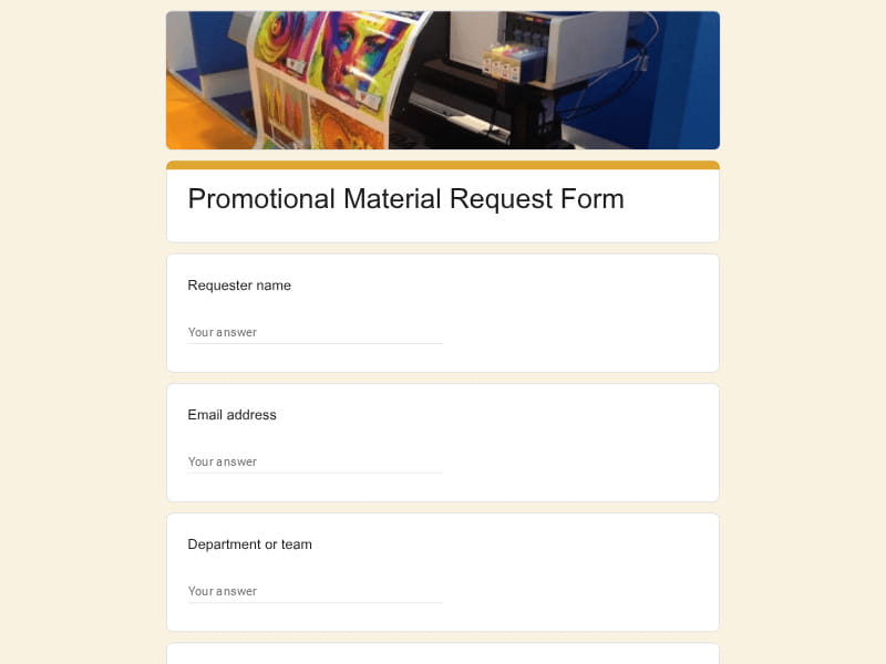 Using this marketing request form in Google Forms makes the process simple and accessible, allowing teams to collect requests in a consistent format, store responses automatically, and review submissions in one shared place. It also helps standardize internal workflows, keeps communication organized, and makes it easier to manage promotional, digital, and website-related marketing tasks.