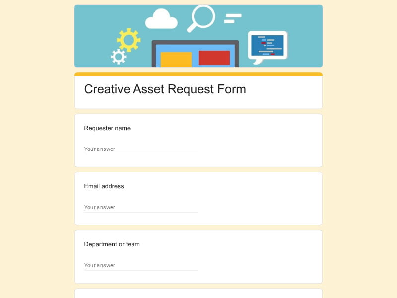 | Creative & Content Needs | Type of marketing material required | Do you need design, copywriting, or video? Is this a content request for social media, blog, or email? |