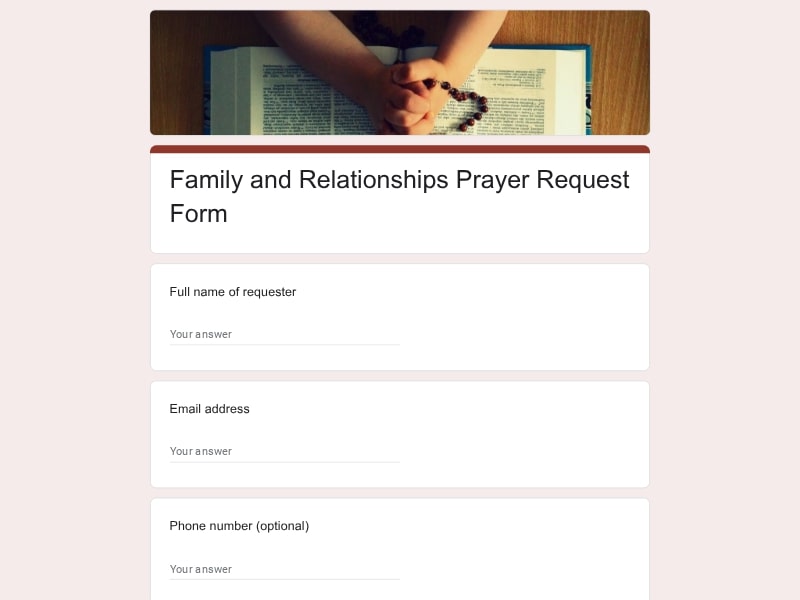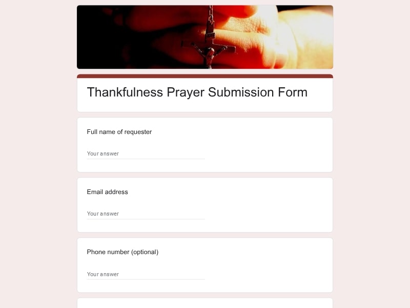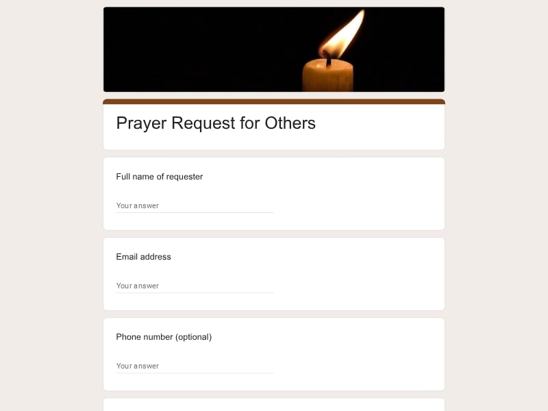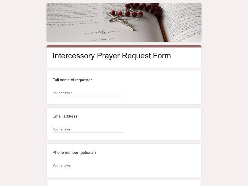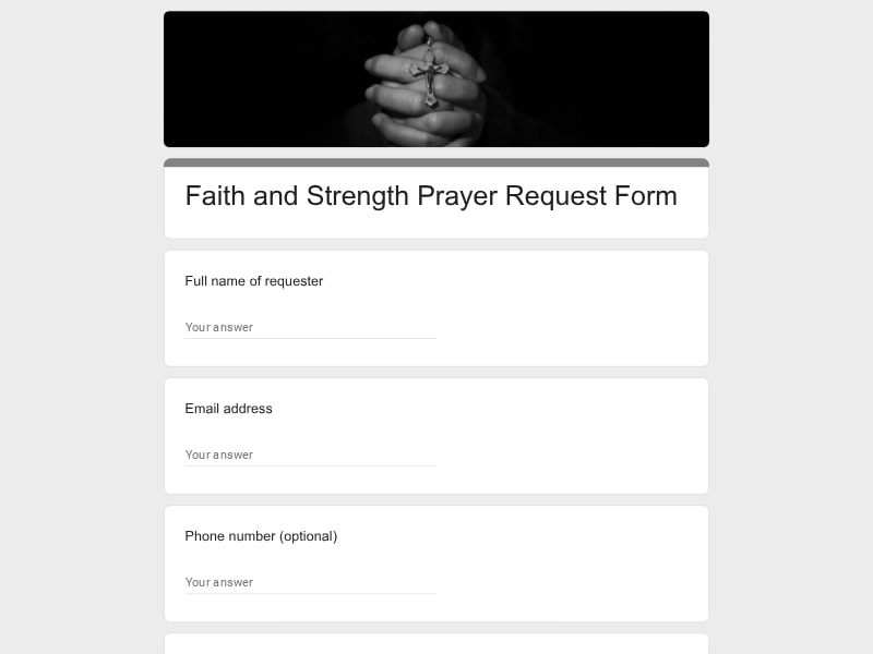 Sometimes organizing prayer requests can be a challenge—but our user-friendly Google Forms template solves that problem, making it easy for congregations, ministries, or other faith groups to collect and manage prayer needs of all kinds.