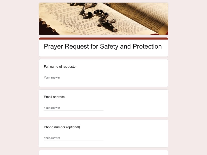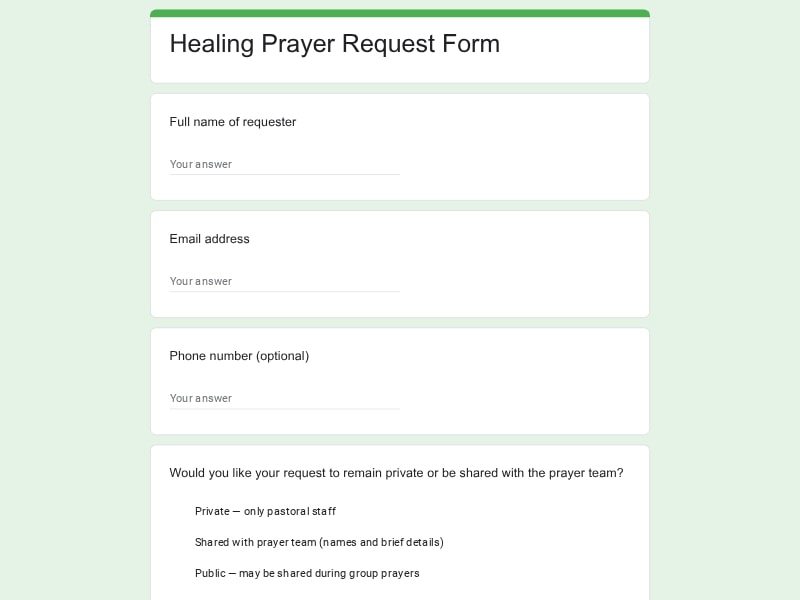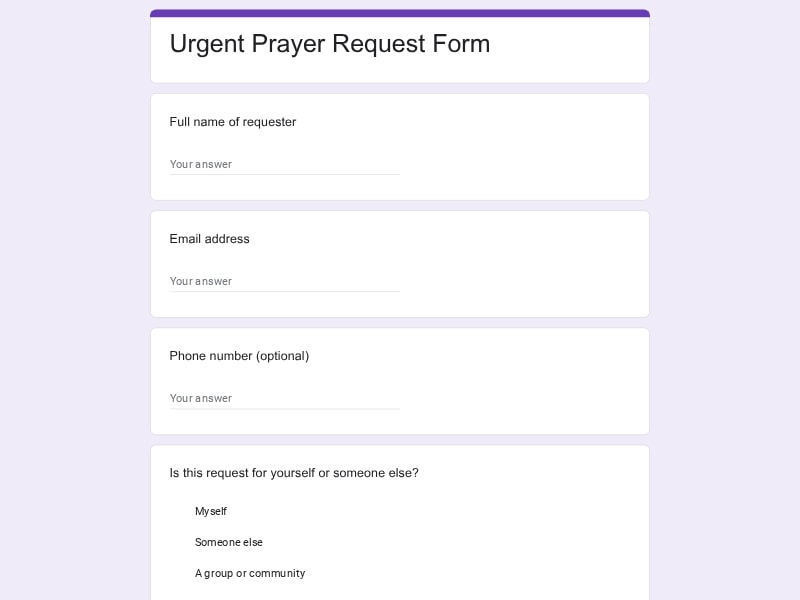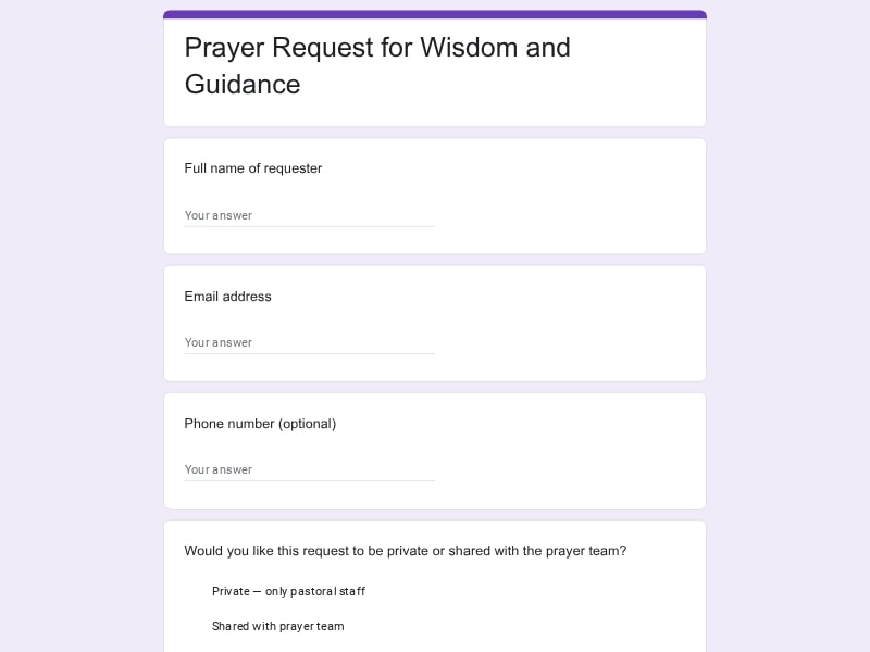 Instead of relying on word of mouth or outdated paper forms, members can now submit their prayer request for themselves, for a child, for their family, or even share an anonymous prayer request—all through one simple and customizable digital form. Whether it's a prayer request for healing or an urgent prayer request, this tool ensures no one is overlooked.